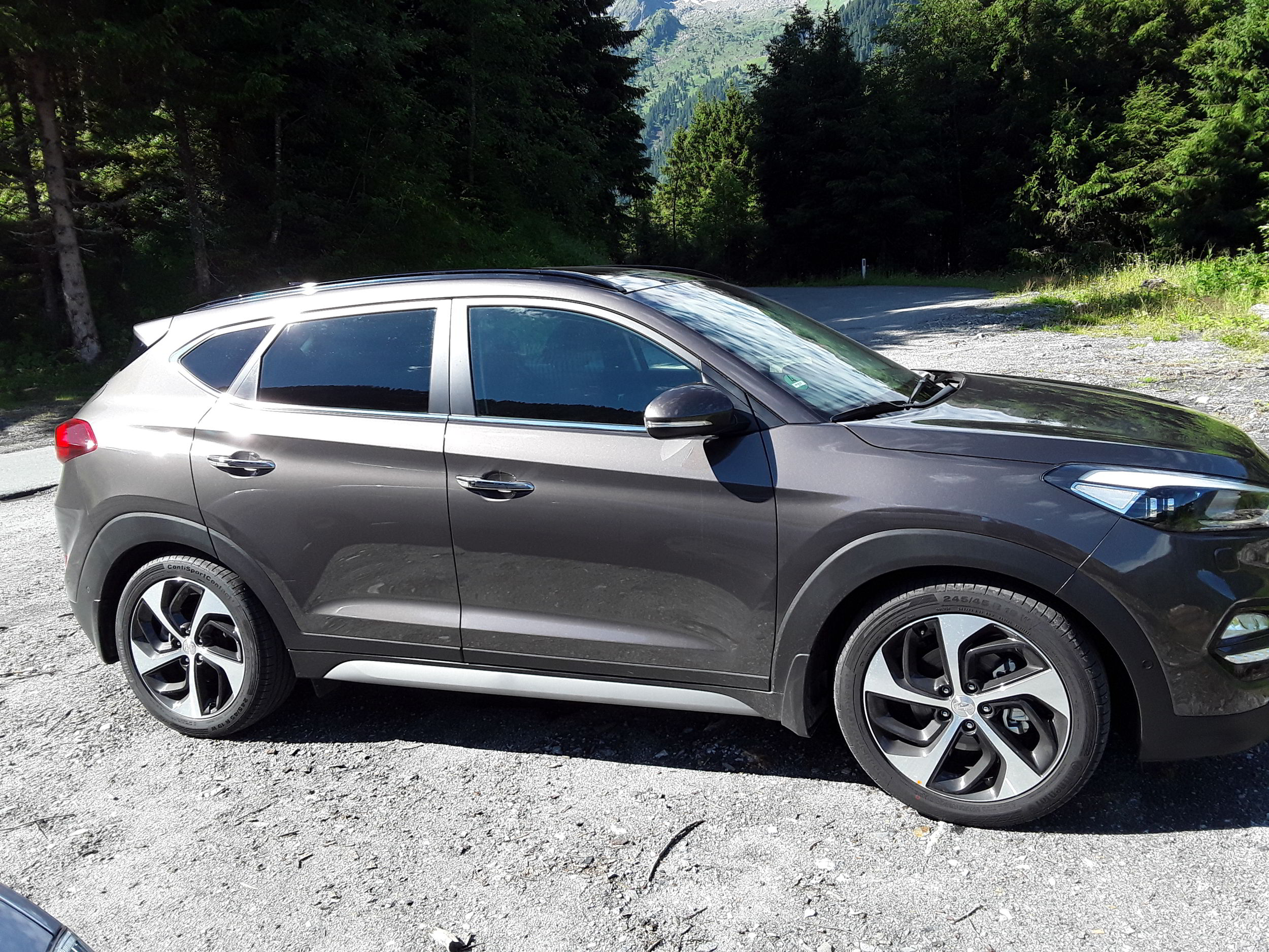Seitenansicht mit Tieferlegung. Technische Daten der Originaltieferlegung durch Hyundai: Vor Tieferlegung vorne 79 cm hinten 84 cm. Nach Tieferlegung vorne 73,5 cm hinten 80,5 cm.