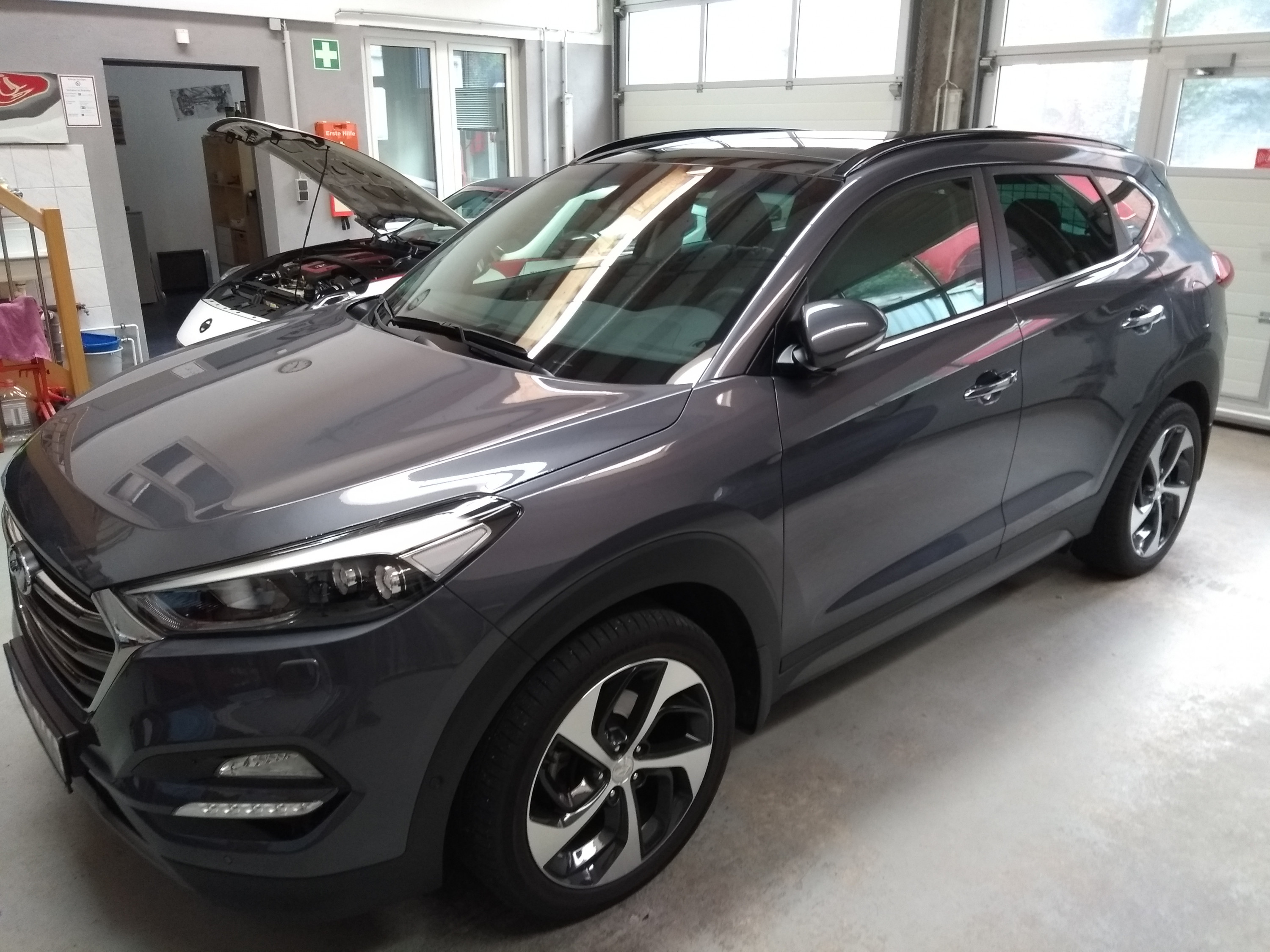 Der Tucson wurde vom Fachmann poliert und mit zwei Schichten Hartpolitur versehen. Der Lack ist unbeschreiblich glatt und hat einen extremen Tiefenglanz und ist sicher vor leichten Kratzern z.B. Hecken. In natura wirkt der Glanz noch intensiver, die Fotos geben das Ergebnis nicht zu 100% wieder.